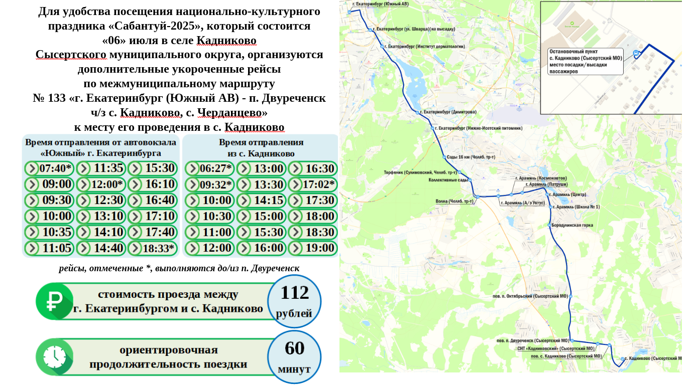 Информирование об организации дополнительных укороченных рейсов по межмуниципальному маршруту № 133 «г. Екатеринбург (Южный АВ) - п. Двуреченск ч/з с. Кадниково, с. Черданцево» к месту его проведения в с. Кадниково