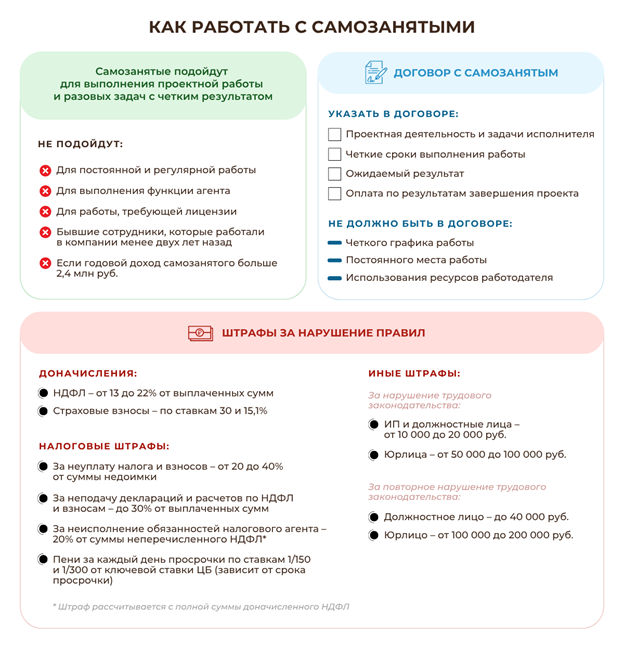 Бизнесу выгодно привлекать самозанятых: они сами платят налоги, не нужно соблюдать требования трудового законодательства и обеспечивать им рабочее место. Но иногда предприниматели смотрят только на эти преимущества, не изучая запреты и ограничения. В итоге самозанятый работает как полноценный сотрудник. Такие отношения налоговая инспекция переквалифицирует в трудовые и доначисляет налоги и крупные штрафы. потому рекомендуется грамотно составлять договор с самозанятым и нанимать их только для разовых работ.