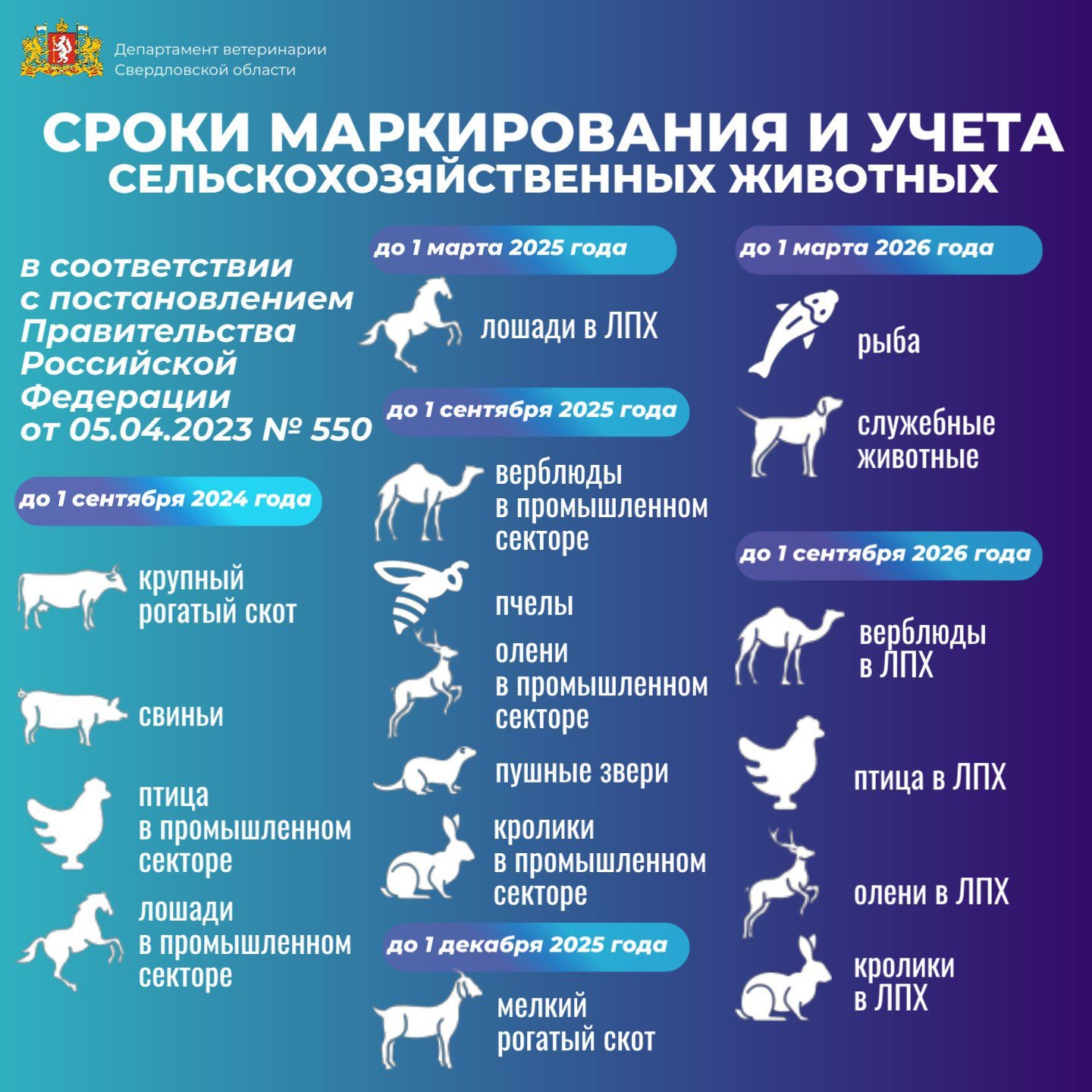 - Мелкий рогатый скот (овцы и козы) – не позднее 1 декабря 2025 года;