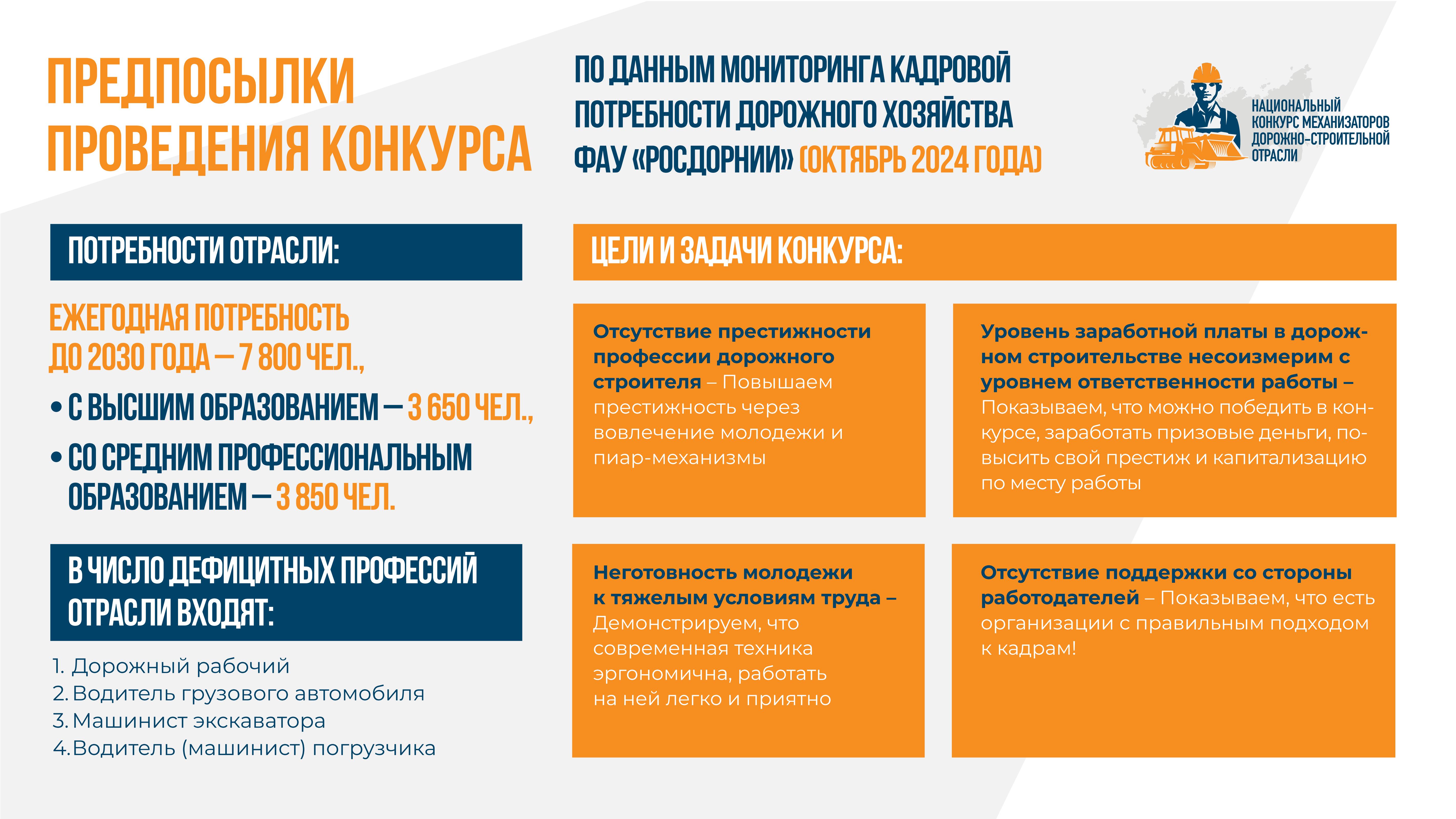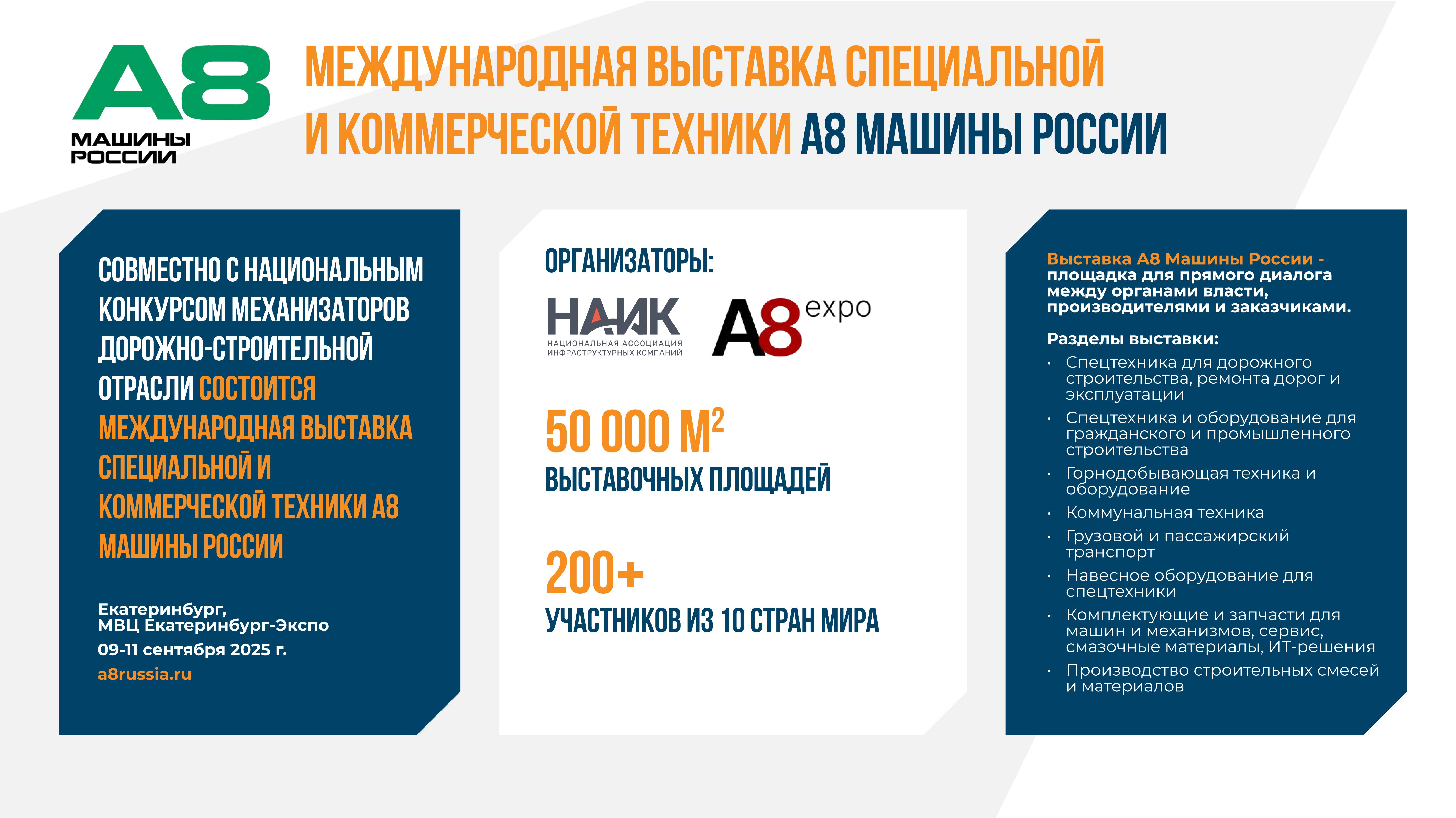 С 9 по 11 сентября 2025 года в г. Екатеринбурге на площадке МВЦ «Екатеринбург-Экспо» состоится Национальный конкурс механизаторов дорожно-строительной отрасли и выставочная экспозиция специальной техники, оборудования для инфраструктурного строительства «А8 МАШИНЫ РОССИИ».