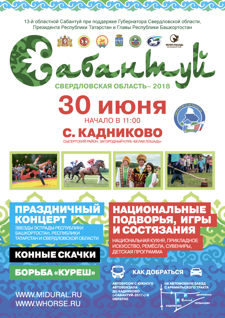 30 июня в Свердловской области пройдет 13-й Областной Сабантуй-2018. Традиционный национально-культурный праздник третий год подряд пройдет в селе Кадниково Сысертского городского округа на территории загородного клуба «Белая лошадь». Ожидается, что свыше 10 тысяч делегатов и гостей из десятка регионов России примут участие в ежегодном народном празднике татар и башкир по случаю окончания весенних полевых работ.