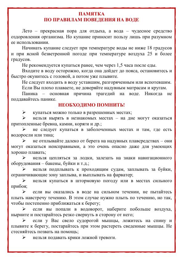 ПАМЯТКА ПО ПРАВИЛАМ НА ВОДНЫХ ОБЪЕКТАХ
