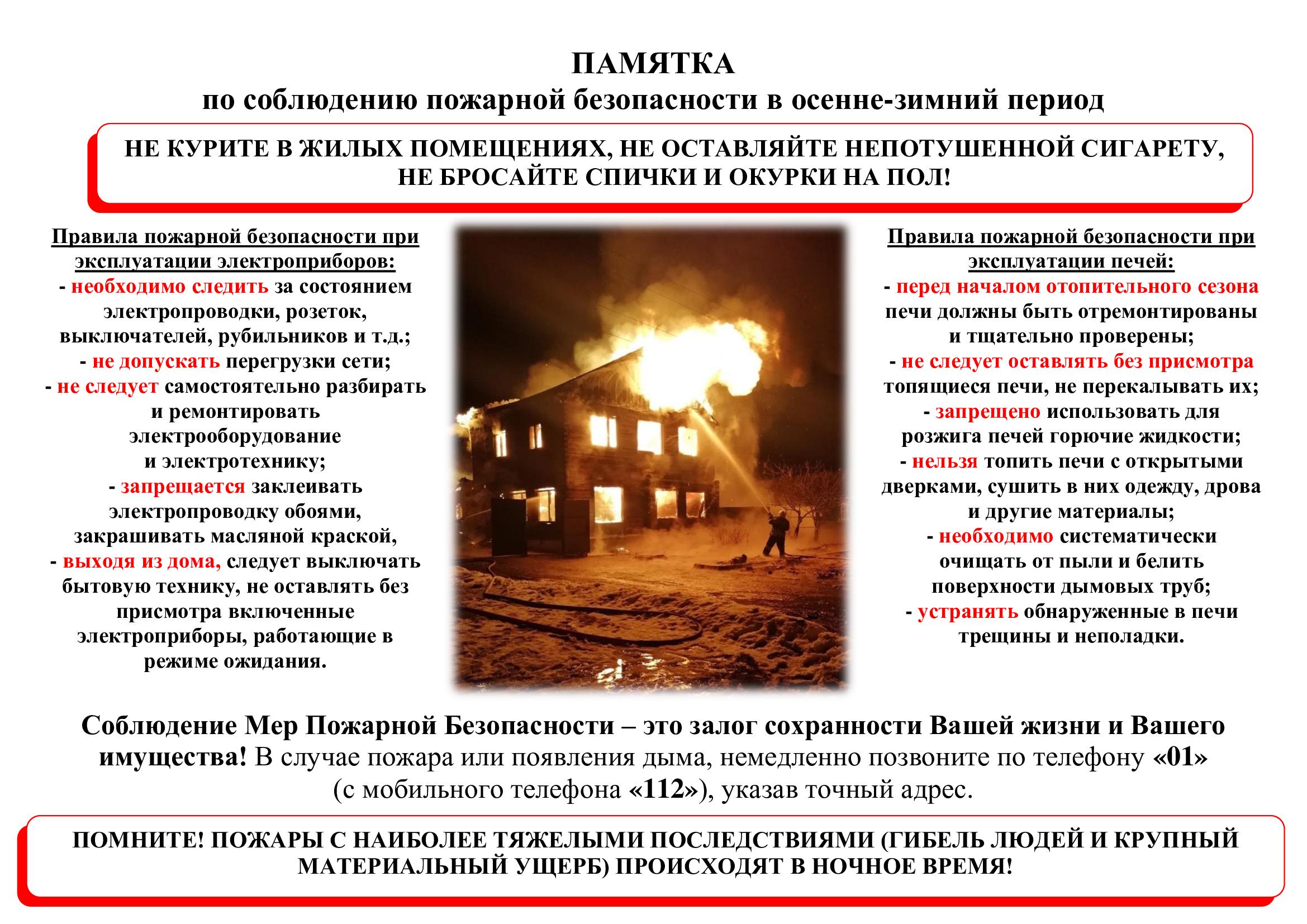 Памятка населению по соблюдению пожарной безопасности в осенне-зимний период!