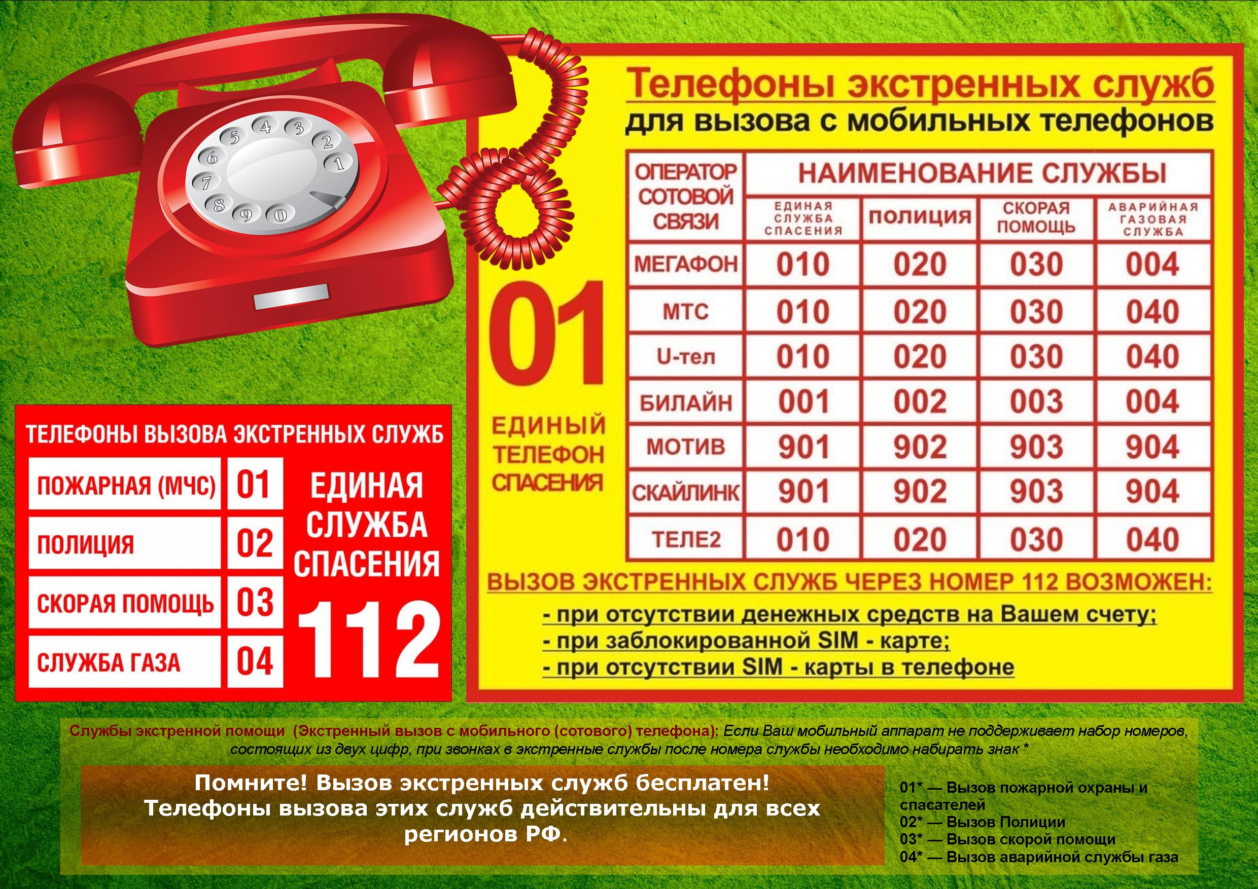 При звонке, как со стационарных, так и с мобильных телефонов, вы можете звонить по телефону Единой службы спасения – 112. Звонок бесплатный. Вы можете связаться со службами экстренной помощи (112) даже в том случае, если ваш номер заблокирован за неуплату или в телефон не вставлена SIM-карта.