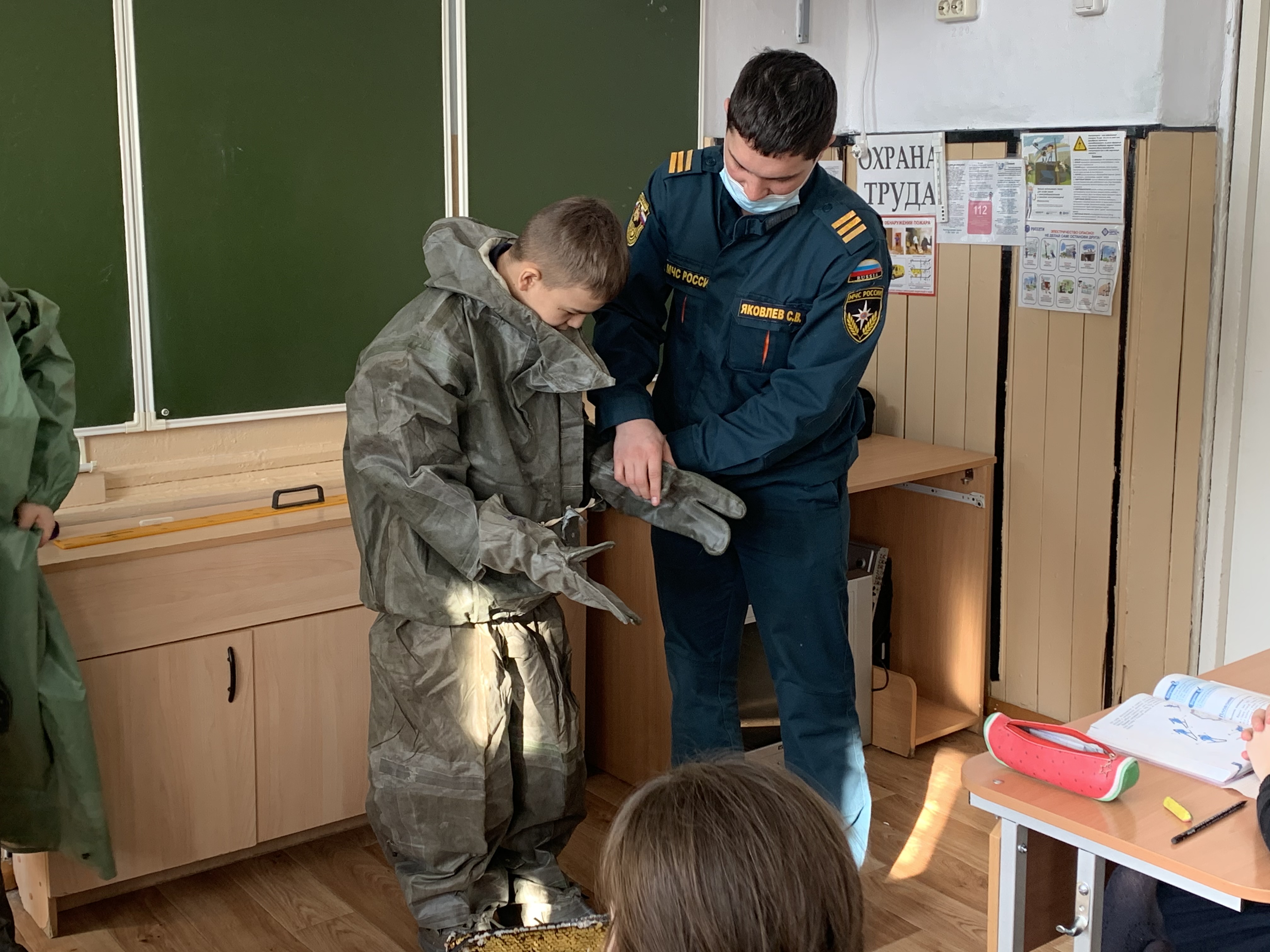 Цель праздника - распространение знания о гражданской обороне и повысить престиж служб спасения. На уроки ОБЖ пришли сотрудники МЧС России 112 пожарно-спасательной части 60 пожарно-спасательного отряда Юркевич Андрей и Сергей Яковлев для того, чтобы наглядно показать ребятам средства химзащиты. Ребята охотно надевали противогазы и одежду химзащиты.