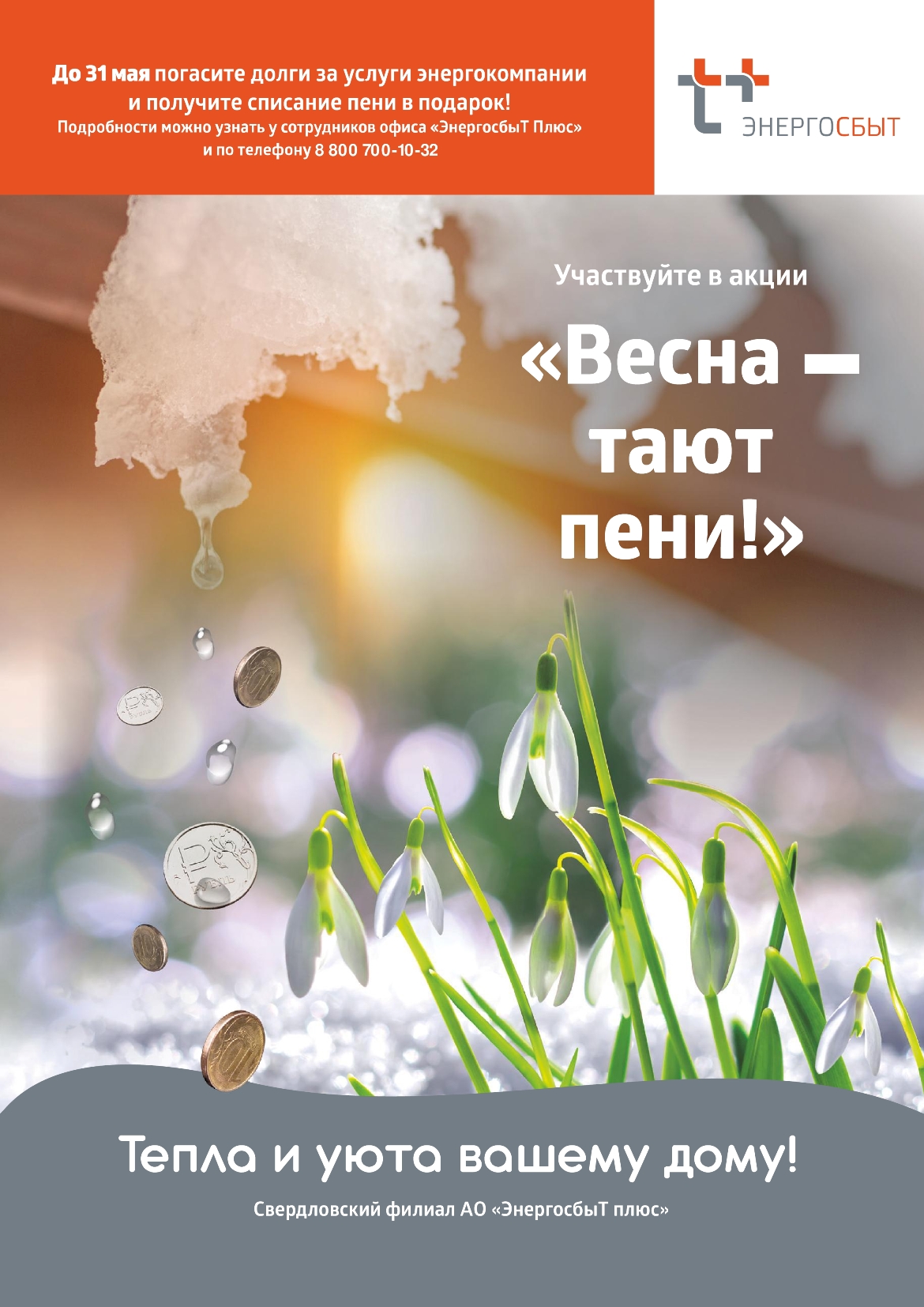 Свердловский филиал «ЭнергосбыТ Плюс» объявляет старт акции «Весна - тают пени!». До 31 мая оплатите сумму основного долга за электроэнергию, отопление и горячую воду и получите списание пени в подарок!