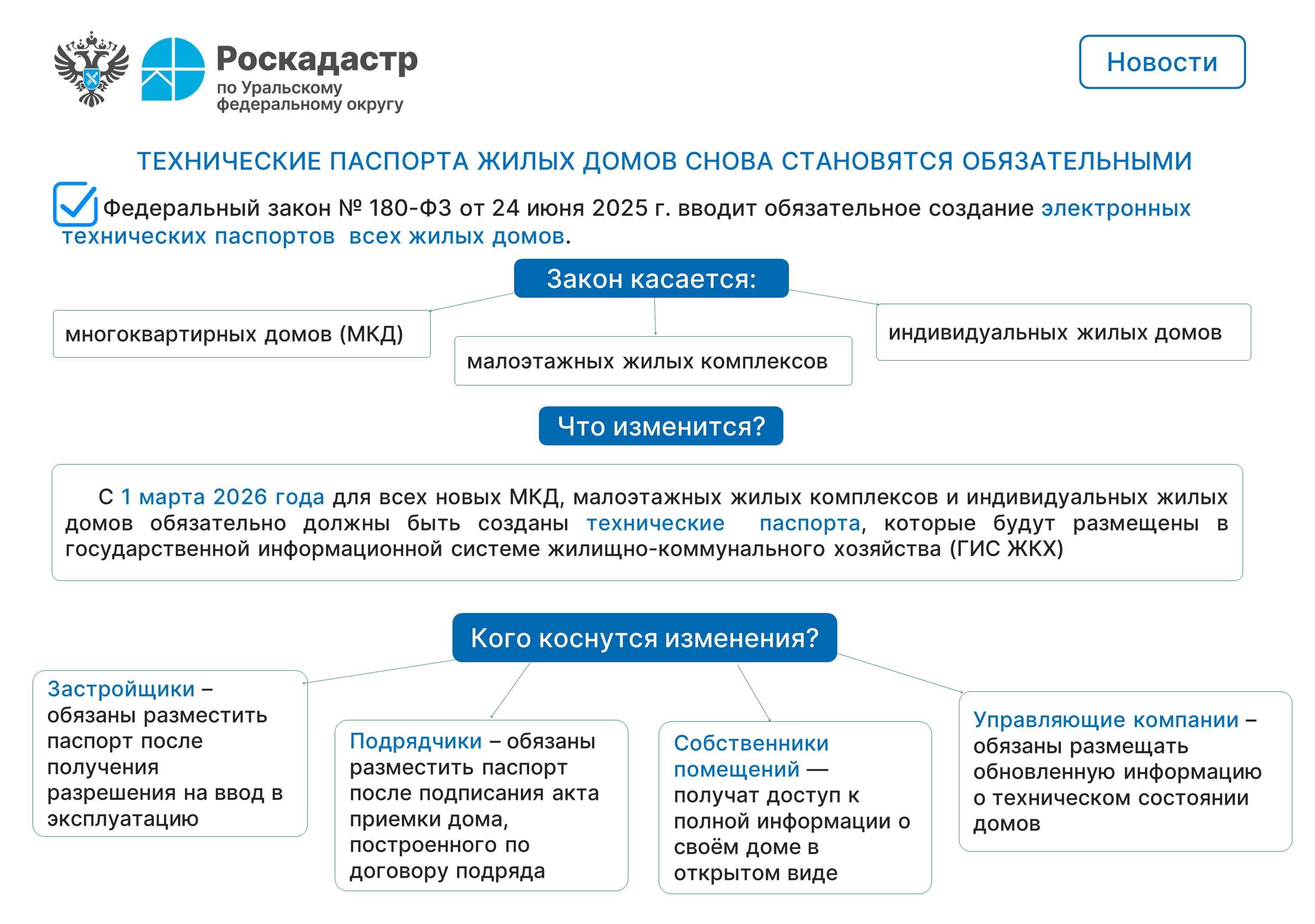 С 1 марта 2026 года для всех новых многоквартирных домов, малоэтажных жилых комплексов и индивидуальных жилых домов обязательно должны быть созданы технические паспорта, которые будут размещены в государственной информационной системе жилищно-коммунального хозяйства (ГИС ЖКХ).