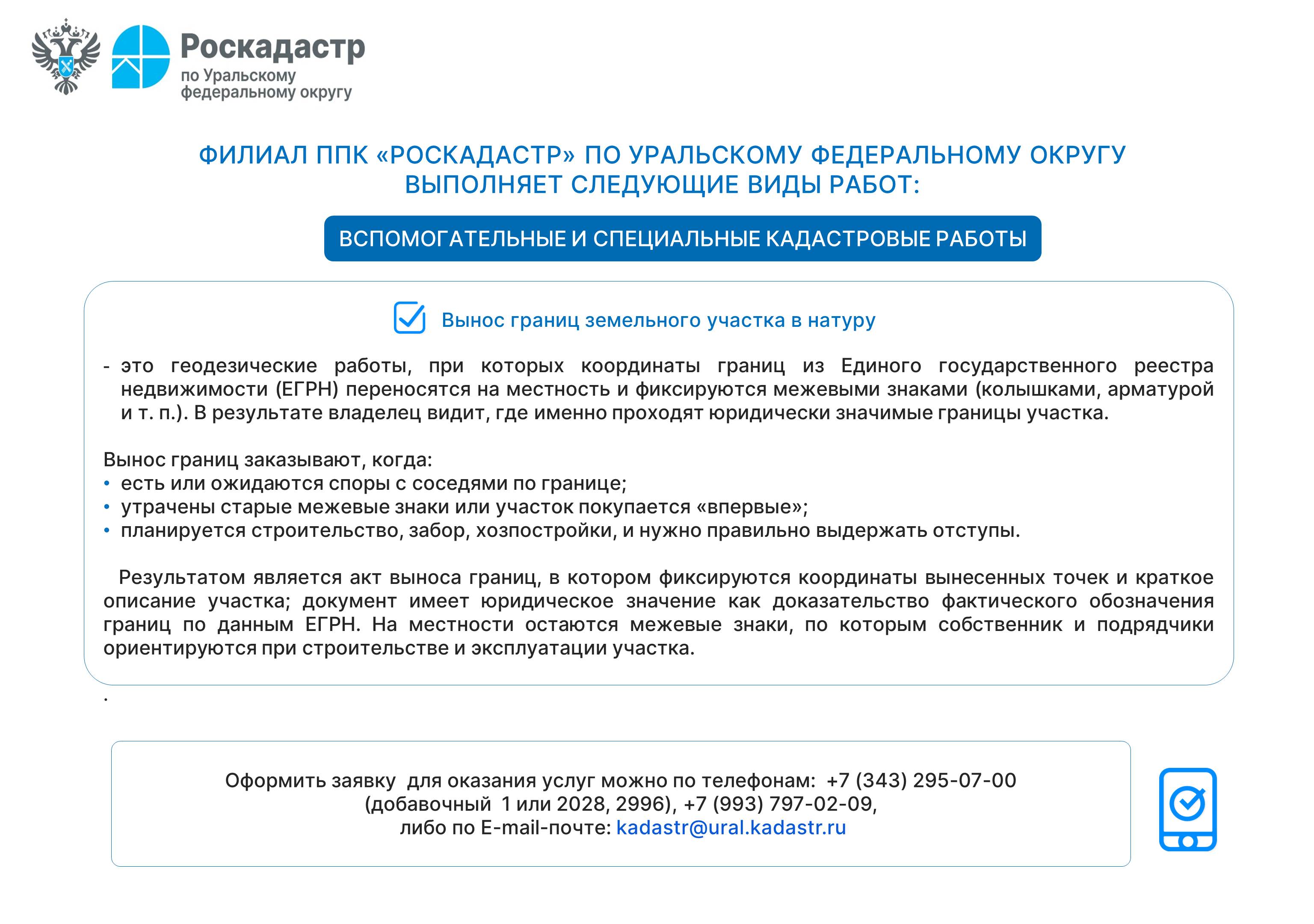 Оформить заявку можно по тел.: +7 (343) 295-07-00 (добавочный 1 или 2028, 2996), +7 (993) 797-02-09 либо по Е-mail-почте: kadastr@ural.kadastr.ru