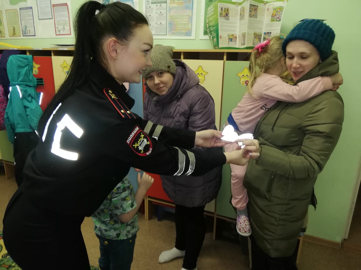 Сначала перед ребятами и взрослыми выступила инспектор отделения ГИБДД Тамара Антропова, которая довела информацию о важности наличия на верхней одежде и сопутствующих предметах различных элементов со световозвращающим эффектом. После небольшой лекции инспектор продемонстрировала малышам каким образом можно изготовить собственными силами из подручных средств – световозвращающей бумаги и ножниц столь необходимые каждому пешеходу аксессуары.
