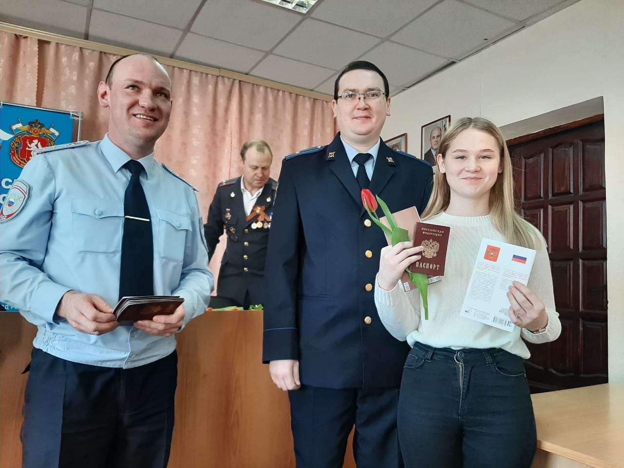 Каждая девушка вместе с паспортом получила цветок и открытку с поздравлениями. В завершении мероприятия мужчины подарили всем присутствующим женщина цветы. После мероприятия состоялось фотографирование. Надеемся, что этот день запомнится молодым девушкам надолго.